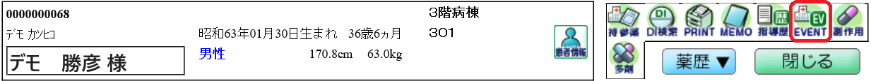 1. テスト患者のページ内、画面上部のTOOLメニューの[EVENT]をクリックします。