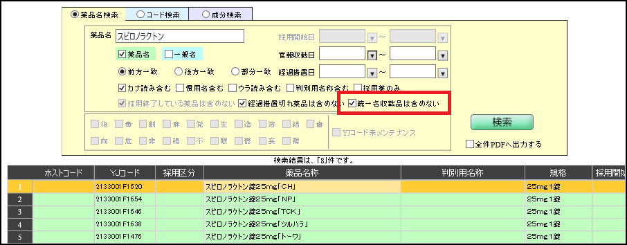 A 薬品検索画面で統一名収載品を除外することができます。