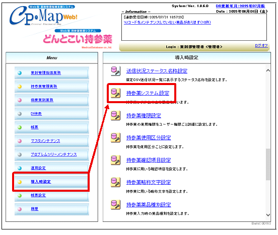 1.メニューより、[導入時設定]を選択し、[持参薬システム設定]をクリックします。