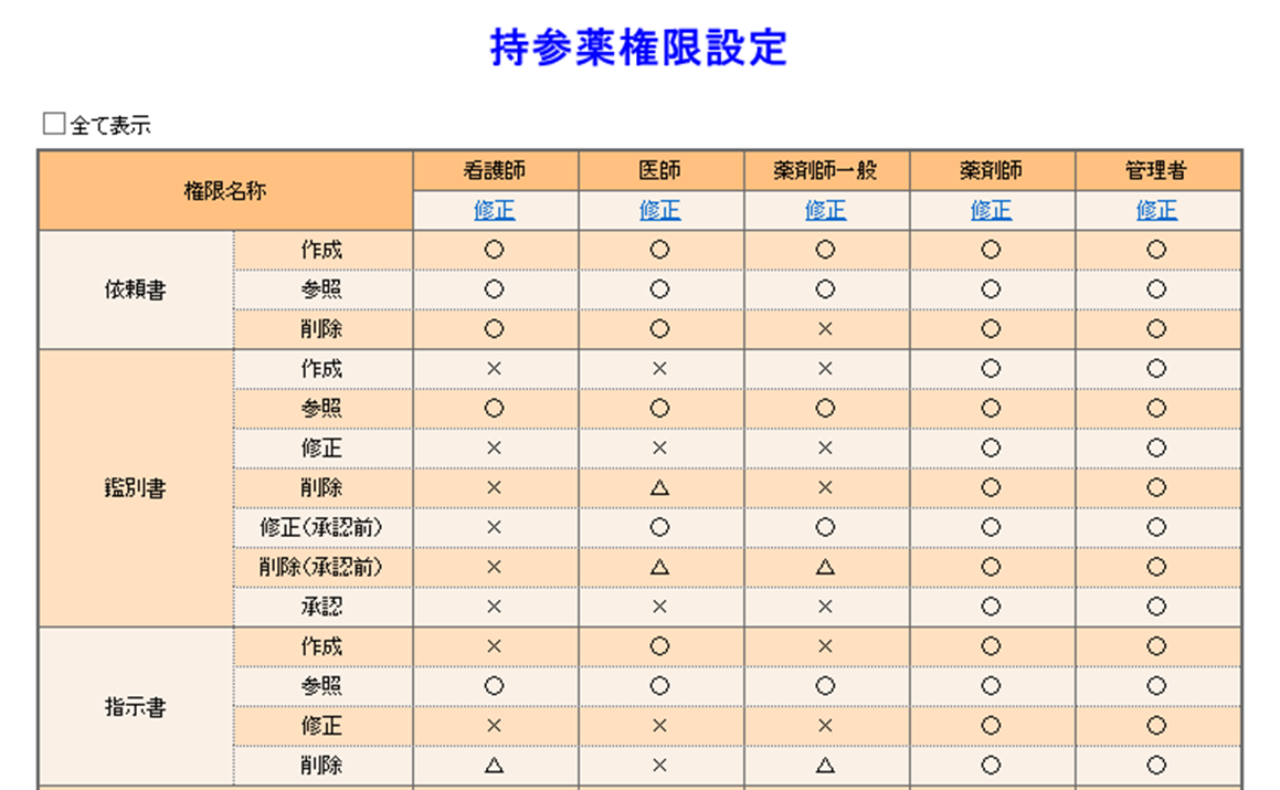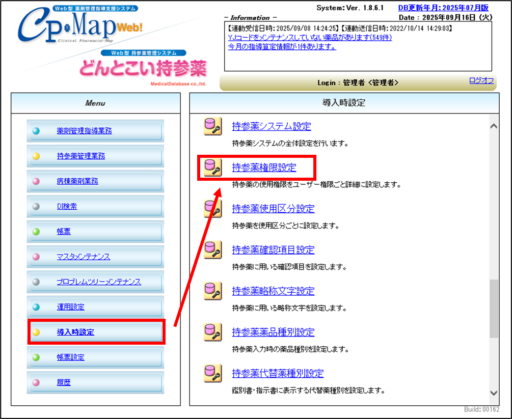 1. TOPメニューより、[導入時設定] – [持参薬権限設定] を選択します。