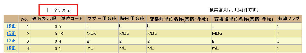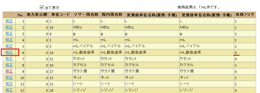 4.有効フラグが[0]になっている項目の[修正]をクリックします。