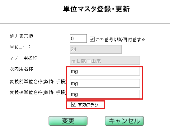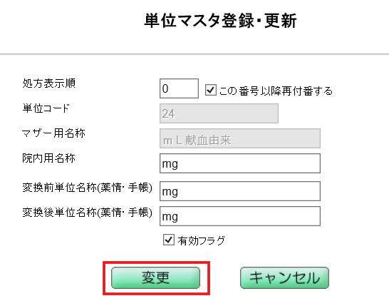 5.[院内用名称]、[変換前単位名称(薬情・手帳)] 、[変換後単位名称(薬情・手帳)]に、追加したい単位を入力します。