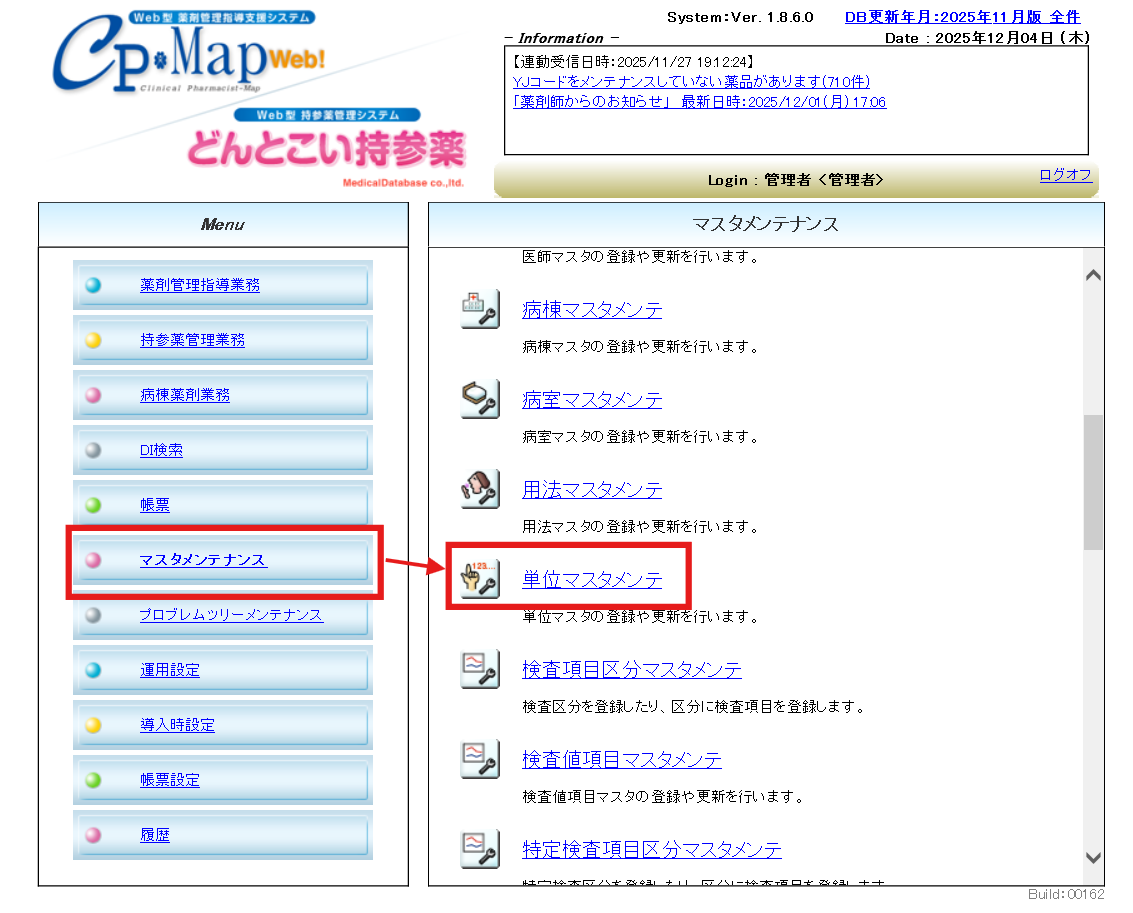1.[マスタメンテナンス]メニューより、[単位マスタメンテ]を選択します。