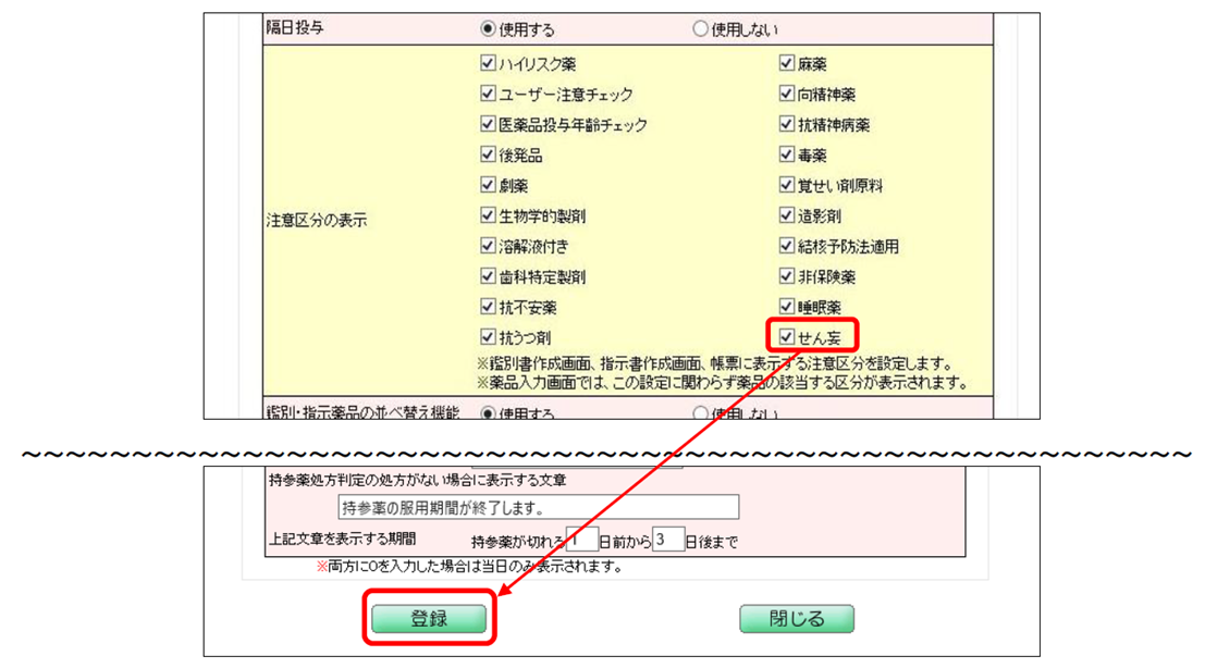 2. [注意区分の表示] – [せん妄] のチェックを入れ、ページ下部[登録]ボタンをクリックします。