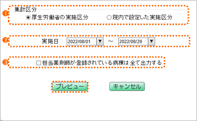 集計区分:出力する集計区分を選択します。厚生労働省/院内で設定した実施区分