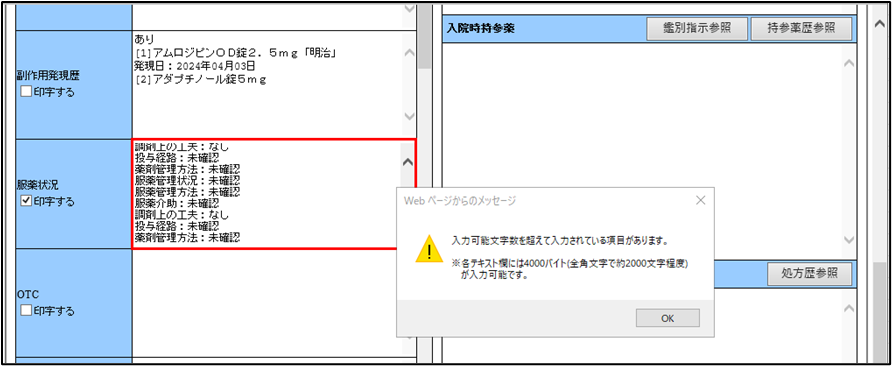 薬品コメント、処方コメントに文字数が多くてもエラーが発生します)