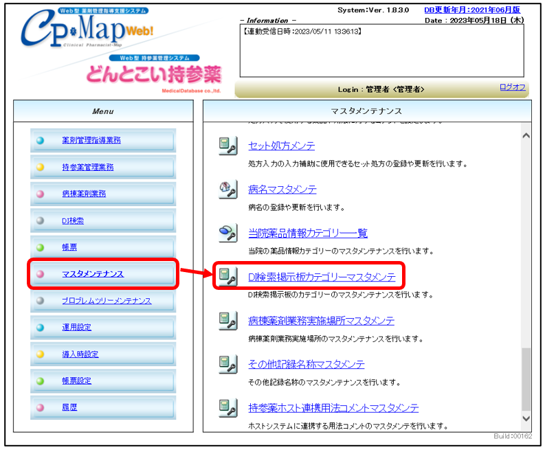 1. メニューより、[マスタメンテナンス]-[DI検索掲示板カテゴリーマスタメンテ]を選択します。