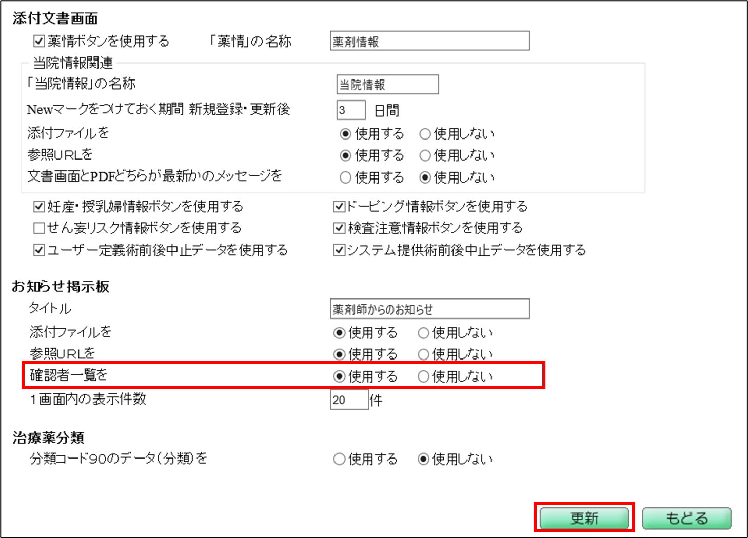 2. 確認者一覧を [使用する]に変更します。更新ボタンをクリックします。